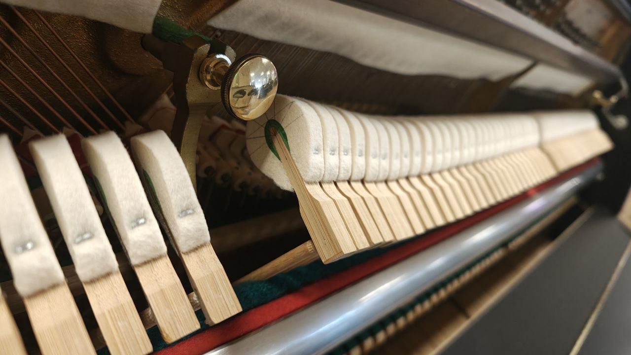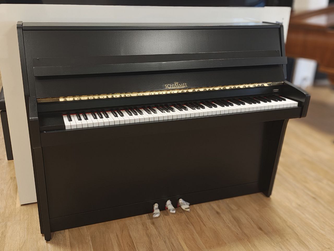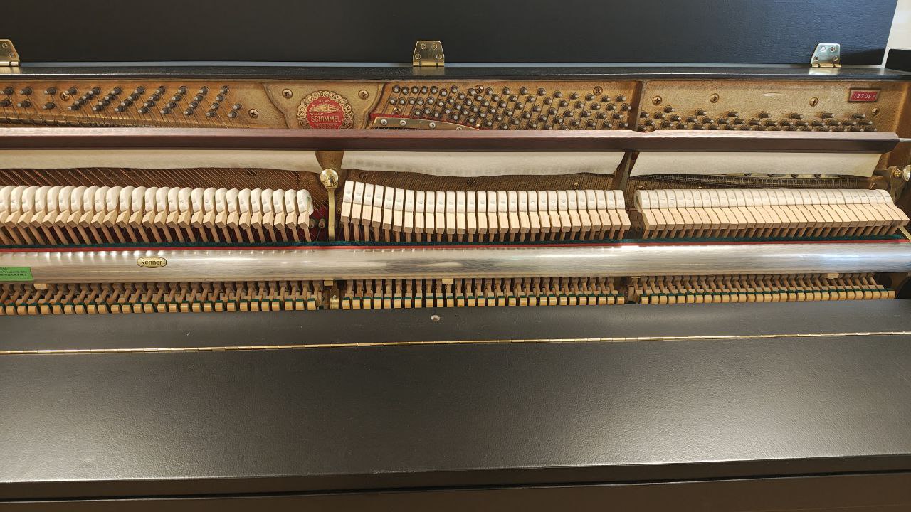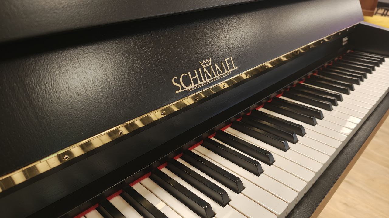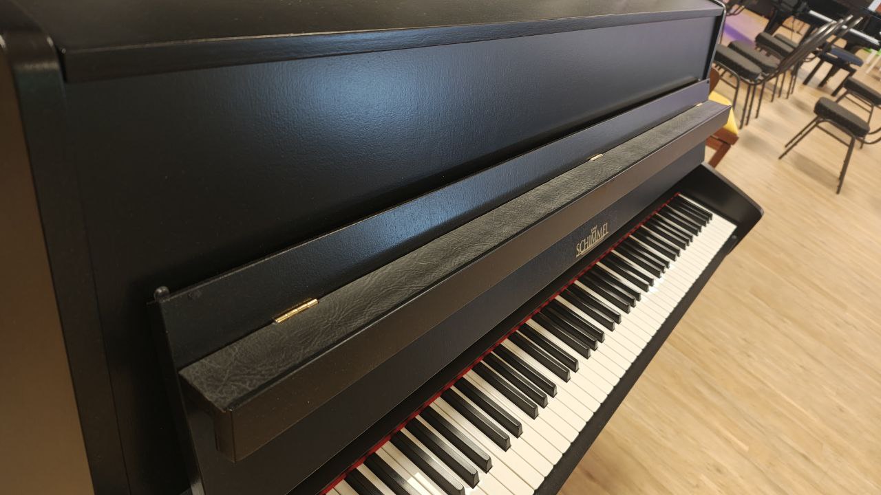 Schimmel 109-M in edlem Schwarz matt, fachgerecht in unserer Meisterwerkstatt überarbeitet. Ausgestattet mit neuen ABEL-Hammerköpfen überzeugt dieses Klavier durch einen kraftvollen, ausgewogenen Klang mit schöner Tragfähigkeit. Das durchgehende Notenpult unterstreicht die klare Linienführung und sorgt für eine großzügige, stabile Auflagefläche. Ein kompaktes Instrument mit überraschend viel Klangvolumen.